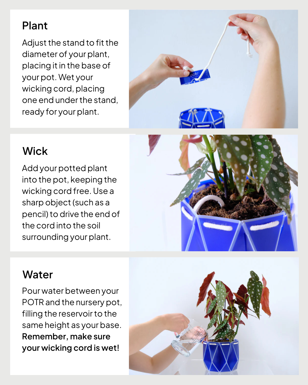 The POTR Pot is designed to hold a reservoir of water in the base. A capillary action wick runs between the reservoir in the base into the soil surrounding your plant. The wick enables your plant to self-regulate its own water intake for up to two weeks at a time. Simply top the reservoir back up when the water level gets low.